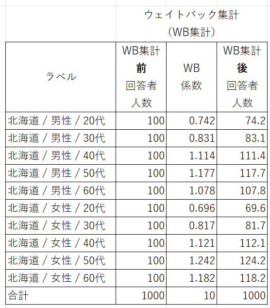 ここに実際の人口構成などの母集団情報をもとに補正をかけて、より現実に近い数値を導くのがウェイトバック集計です。